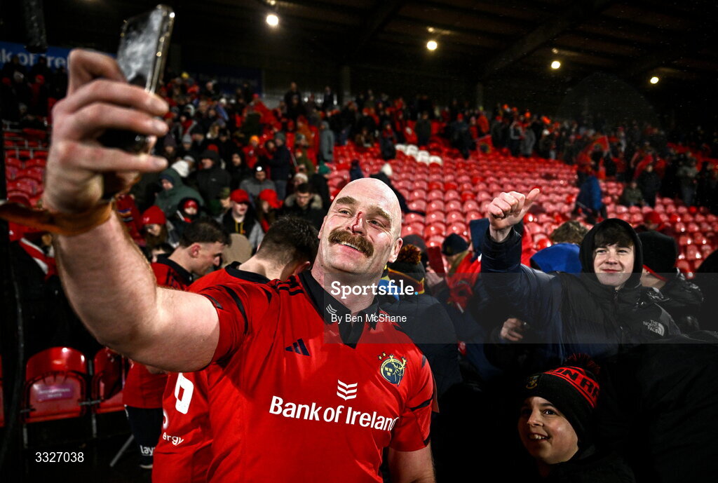 23 January 2026; Oli Jager of Munster takes a selfie with supporters after the United Rugby Championship match between Munster and Dragons at Virgin Media Park in Cork. Photo by Ben McShane/Sportsfile