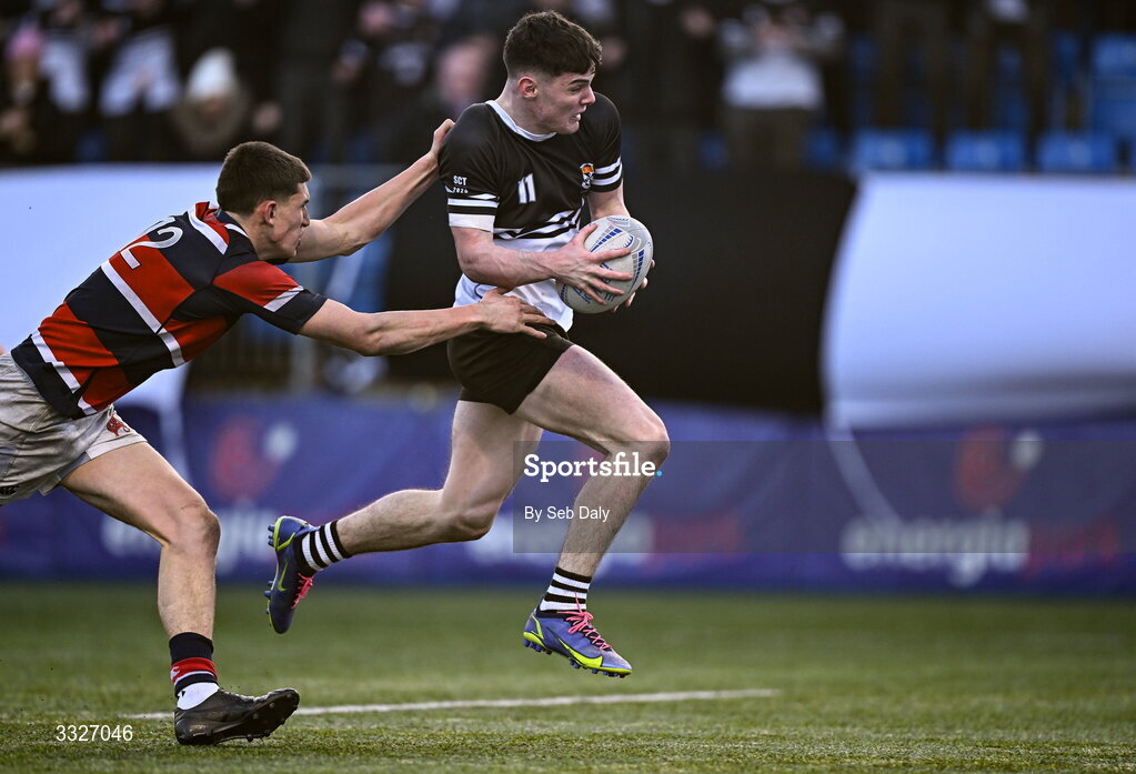 23 January 2026; Luke Kelly of Newbridge College on his way to scoring his side's fifth try during the Bank of Ireland Leinster Rugby Boys Schools Senior Cup first round match between Newbridge College and Wesley College at Energia Park in Dublin. Photo by Seb Daly/Sportsfile