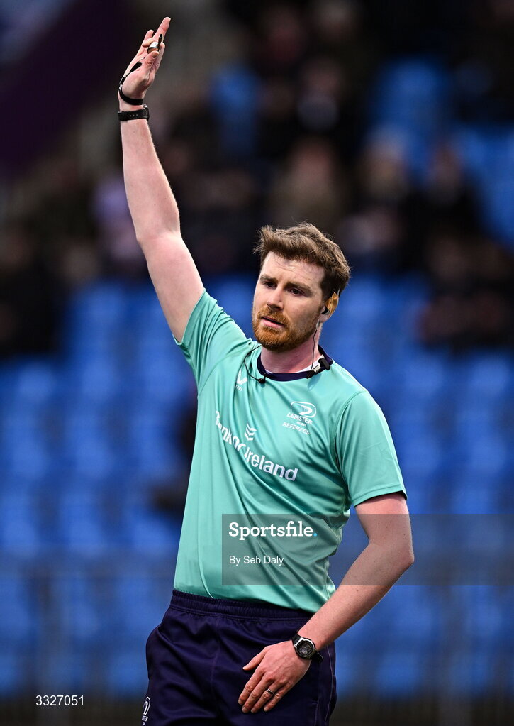 23 January 2026; Referee Kevin Beakey during the Bank of Ireland Leinster Rugby Boys Schools Senior Cup first round match between Newbridge College and Wesley College at Energia Park in Dublin. Photo by Seb Daly/Sportsfile