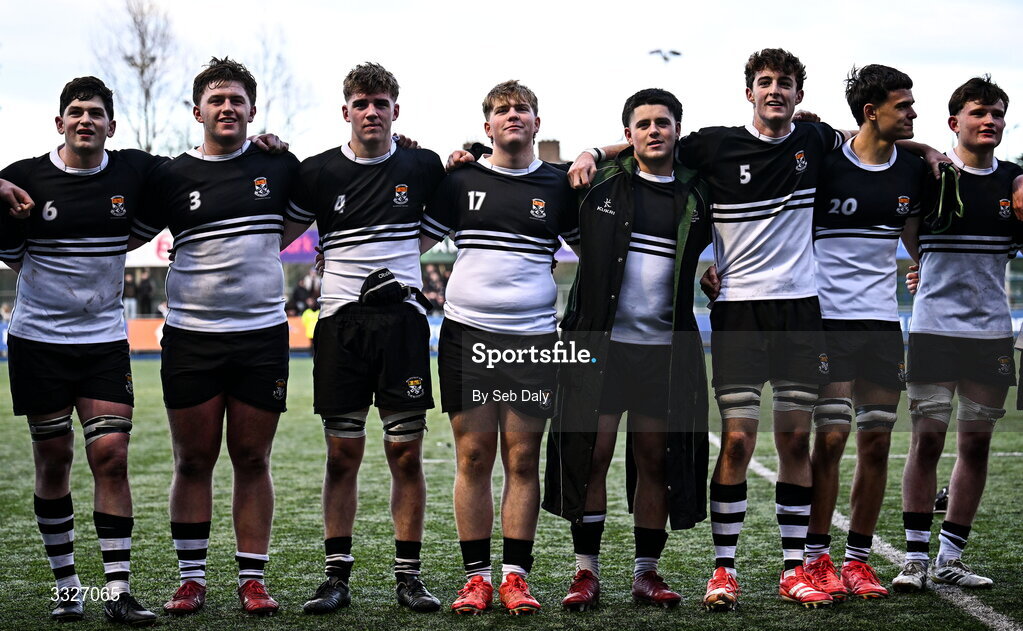 23 January 2026; Newbridge College players after their side's victory in the Bank of Ireland Leinster Rugby Boys Schools Senior Cup first round match between Newbridge College and Wesley College at Energia Park in Dublin. Photo by Seb Daly/Sportsfile