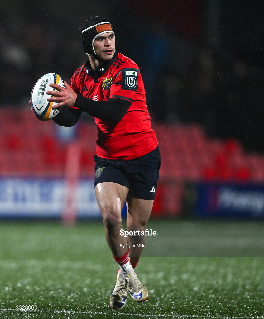 23 January 2026; Thaakir Abrahams of Munster during the United Rugby Championship match between Munster and Dragons at Virgin Media Park in Cork. Photo by Tyler Miller/Sportsfile
