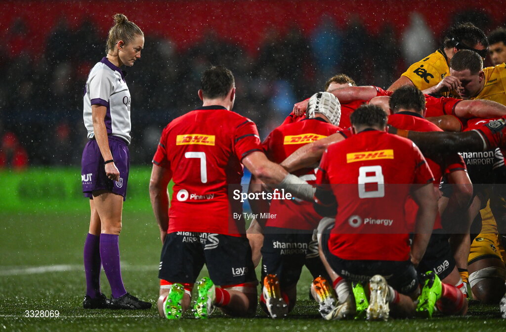 23 January 2026; Referee Hollie Davidson during the United Rugby Championship match between Munster and Dragons at Virgin Media Park in Cork. Photo by Tyler Miller/Sportsfile