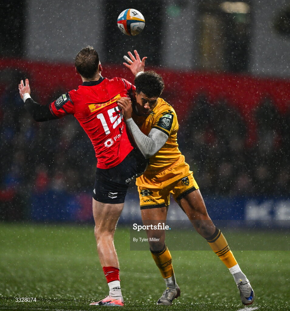 23 January 2026; Mike Haley of Munster is tackled by Rio Dyer of Dragons during the United Rugby Championship match between Munster and Dragons at Virgin Media Park in Cork. Photo by Tyler Miller/Sportsfile
