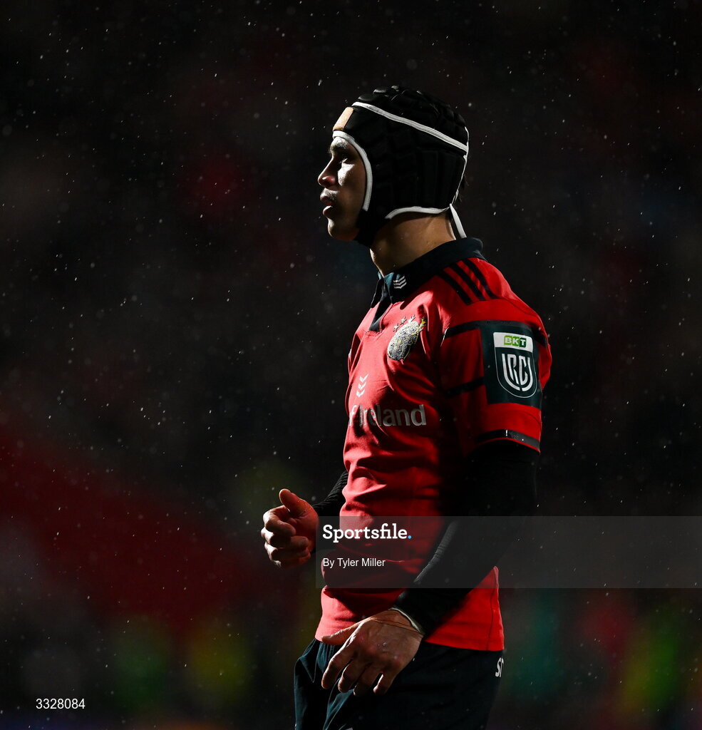 23 January 2026; Thaakir Abrahams of Munster during the United Rugby Championship match between Munster and Dragons at Virgin Media Park in Cork. Photo by Tyler Miller/Sportsfile