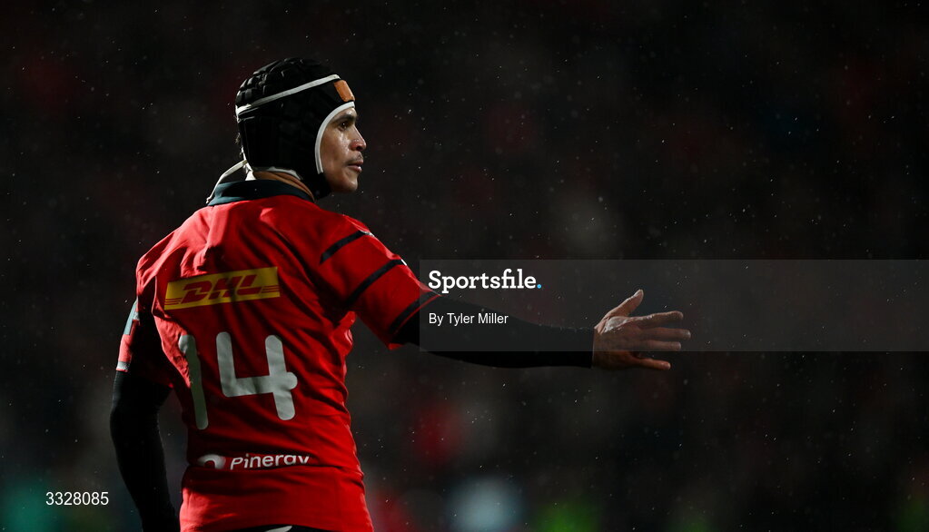 23 January 2026; Thaakir Abrahams of Munster during the United Rugby Championship match between Munster and Dragons at Virgin Media Park in Cork. Photo by Tyler Miller/Sportsfile