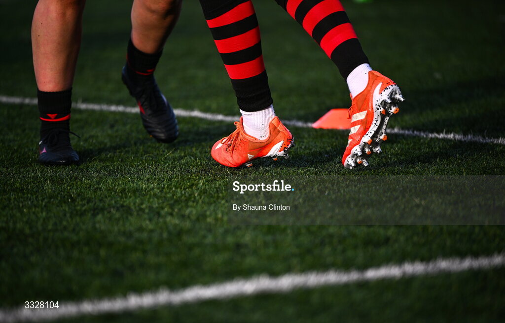 25 January 2026; A detailed view of Brython Thunder players' boots as they warm-up before the Celtic Challenge Round 5 match between Clovers and Brython Thunder at Virgin Media Park in Cork. Photo by Shauna Clinton/Sportsfile