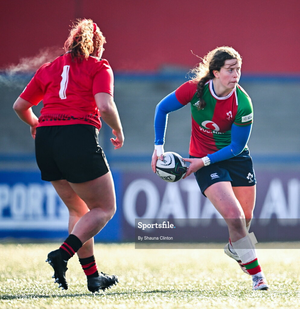 25 January 2026; Caitríona Finn of Clovers in action against Stella Orrin of Brython Thunder during the Celtic Challenge Round 5 match between Clovers and Brython Thunder at Virgin Media Park in Cork. Photo by Shauna Clinton/Sportsfile