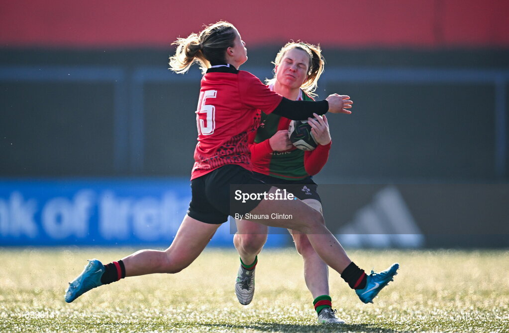 25 January 2026; Alana McInerney of Clovers is tackled by Amy Williams of Brython Thunder during the Celtic Challenge Round 5 match between Clovers and Brython Thunder at Virgin Media Park in Cork. Photo by Shauna Clinton/Sportsfile