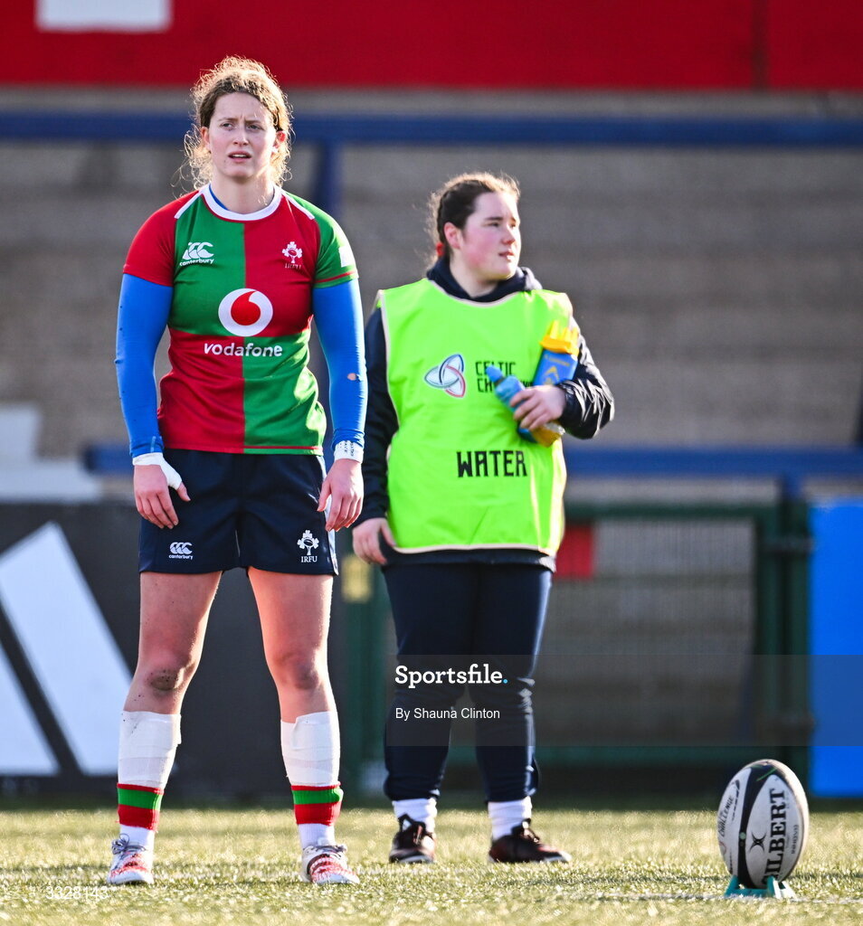 25 January 2026; Caitríona Finn of Clovers prepares to kick a conversion during the Celtic Challenge Round 5 match between Clovers and Brython Thunder at Virgin Media Park in Cork. Photo by Shauna Clinton/Sportsfile