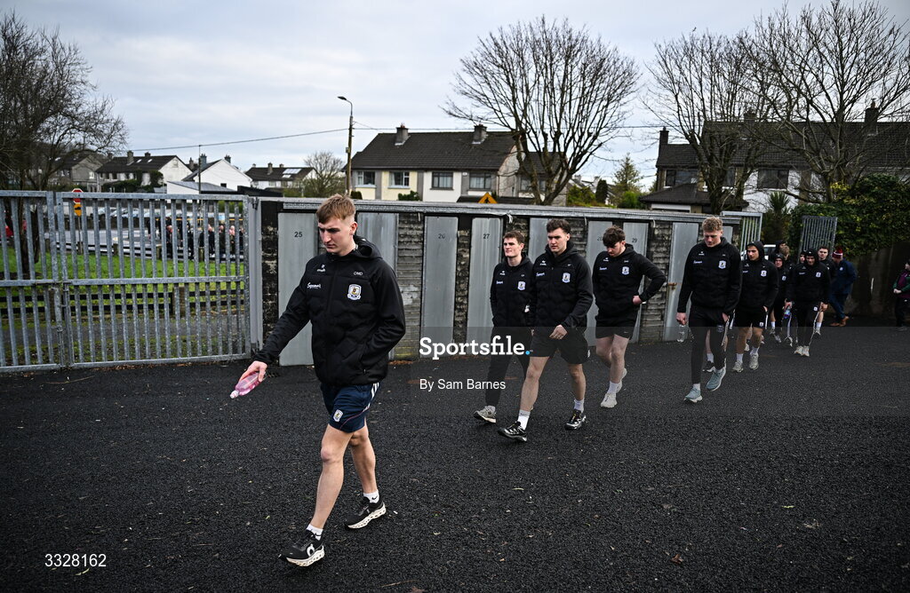 25 January 2026; Oisín McDonagh of Galway, left, and teammates arrive before the Allianz Football League Division 1 match between Galway and Mayo at Pearse Stadium in Galway. Photo by Sam Barnes/Sportsfile
