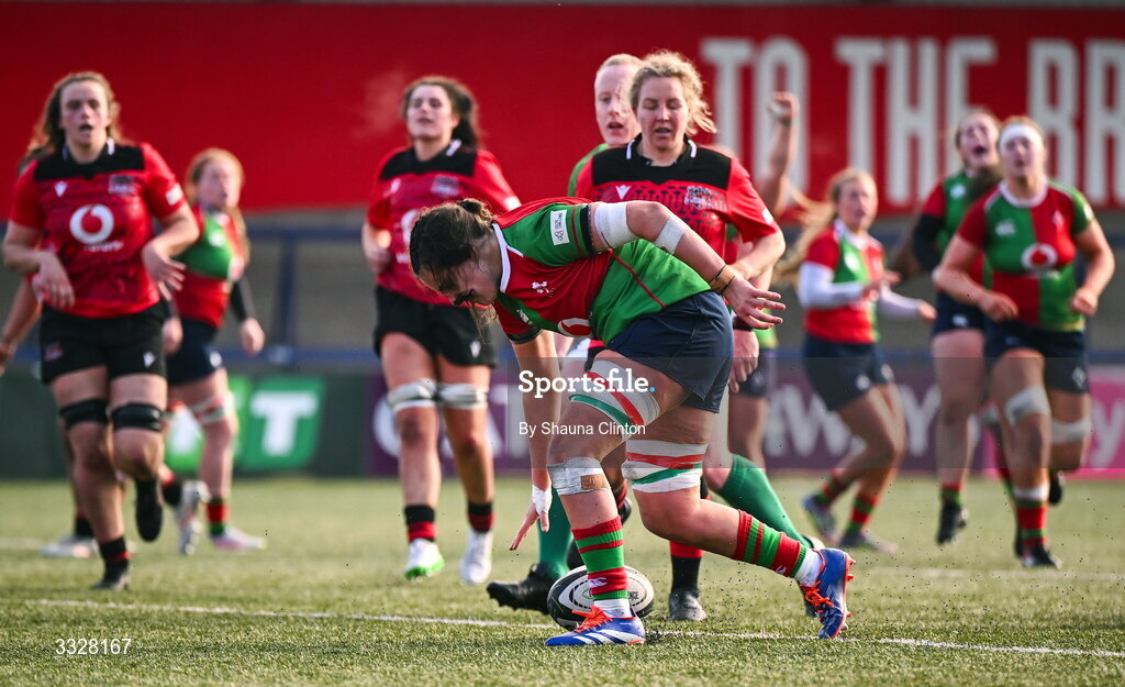 25 January 2026; Annakate Cournane of Clovers scores her side's second try during the Celtic Challenge Round 5 match between Clovers and Brython Thunder at Virgin Media Park in Cork. Photo by Shauna Clinton/Sportsfile