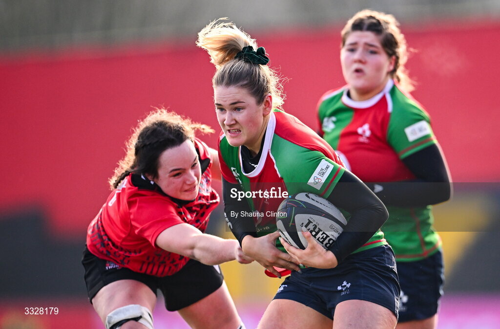 25 January 2026; Aoife Corey of Clovers in action against Jess Rogers of Brython Thunder during the Celtic Challenge Round 5 match between Clovers and Brython Thunder at Virgin Media Park in Cork. Photo by Shauna Clinton/Sportsfile