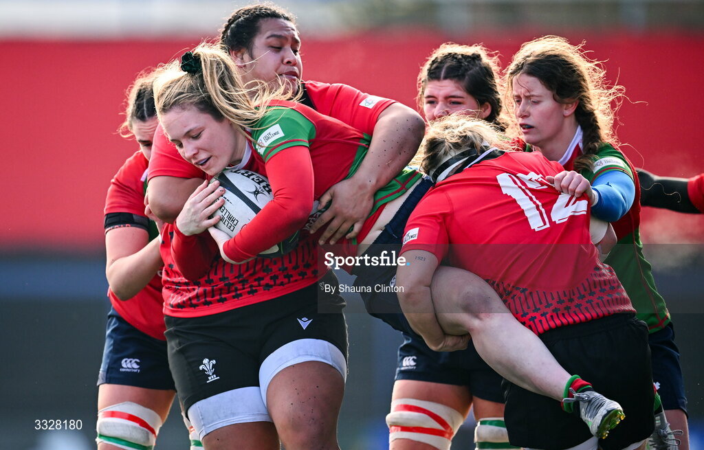 25 January 2026; Alana McInerney of Clovers in action against Brython Thunder players Sisilia Tuipulotu, left, and Hannah Bluck during the Celtic Challenge Round 5 match between Clovers and Brython Thunder at Virgin Media Park in Cork. Photo by Shauna Clinton/Sportsfile