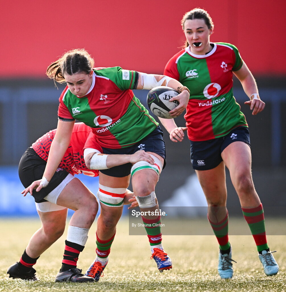 25 January 2026; Annakate Cournane of Clovers is tackled by Hannah Bluck of Brython Thunder during the Celtic Challenge Round 5 match between Clovers and Brython Thunder at Virgin Media Park in Cork. Photo by Shauna Clinton/Sportsfile