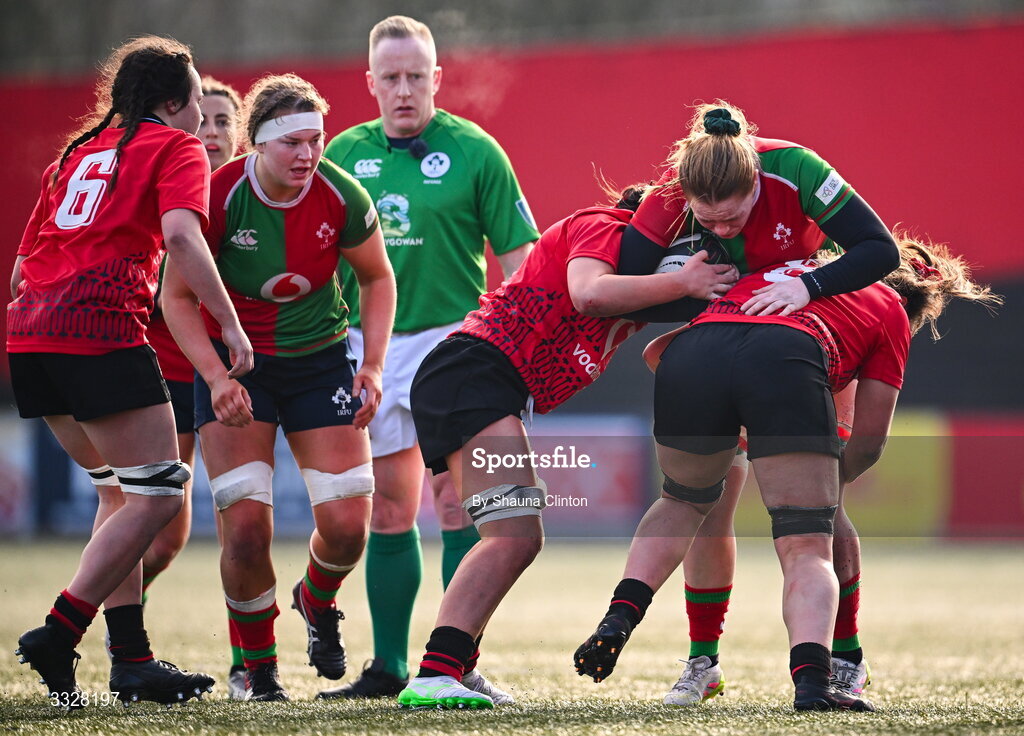 25 January 2026; Rosie Searle of Clovers is tackled by Brython Thunder players Lucy Isaac, left, and Branwen Metcalfe during the Celtic Challenge Round 5 match between Clovers and Brython Thunder at Virgin Media Park in Cork. Photo by Shauna Clinton/Sportsfile