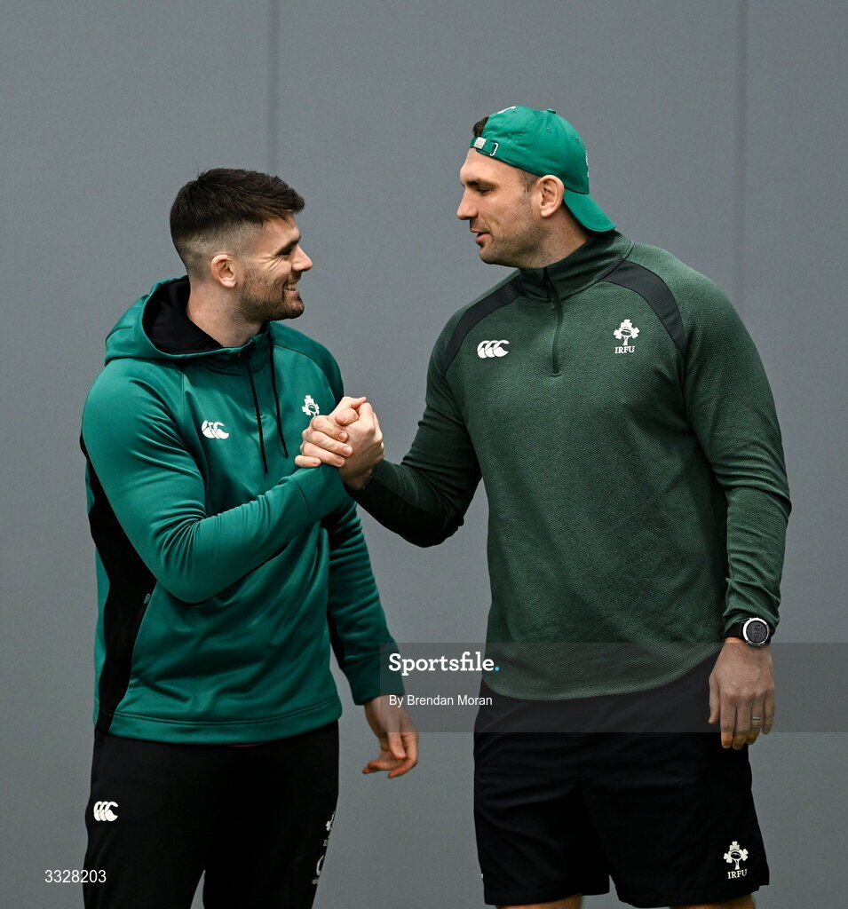 25 January 2026; Harry Byrne, left, and Tadhg Beirne during the Ireland team assembly day at the IRFU High Performance Centre in Dublin ahead of the 2026 Guinness Six Nations Rugby Championship. Photo by Brendan Moran/Sportsfile
