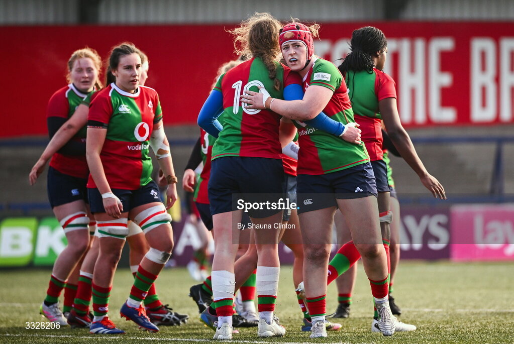 25 January 2026; Clovers players, including Siobhán McCarthy, centre, celebrate their side's second try during the Celtic Challenge Round 5 match between Clovers and Brython Thunder at Virgin Media Park in Cork. Photo by Shauna Clinton/Sportsfile