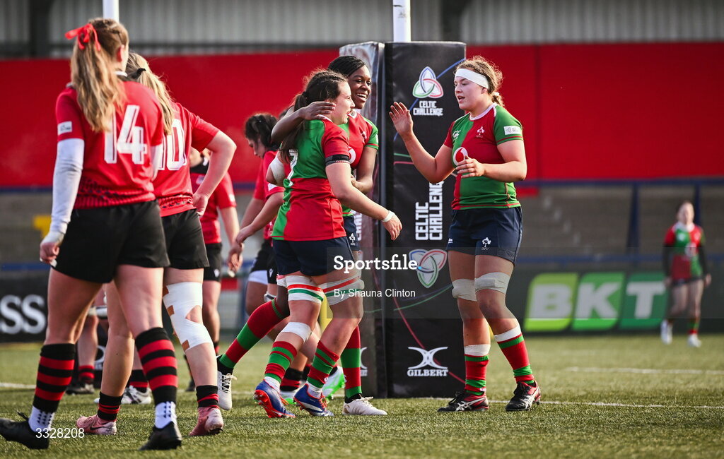 25 January 2026; Annakate Cournane of Clovers, centre, is congratulated by team-mate Faith Oviawe after scoring their side's second try during the Celtic Challenge Round 5 match between Clovers and Brython Thunder at Virgin Media Park in Cork. Photo by Shauna Clinton/Sportsfile