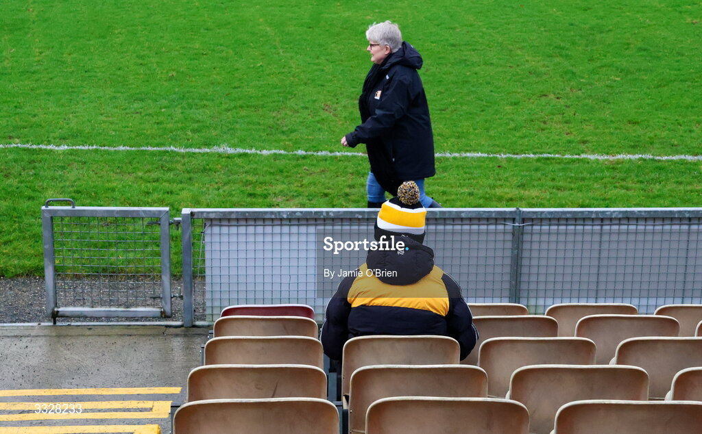 25 January 2026; Mary Morgan, Communications Officer, Kilkenny GAA, walks past as supporter Paddy Cunningham, from Callan, awaits the start of the Allianz Hurling League Division 1A match between Kilkenny and Offaly at UPMC Nowlan Park in Kilkenny. Photo by Jamie O'Brien/Sportsfile
