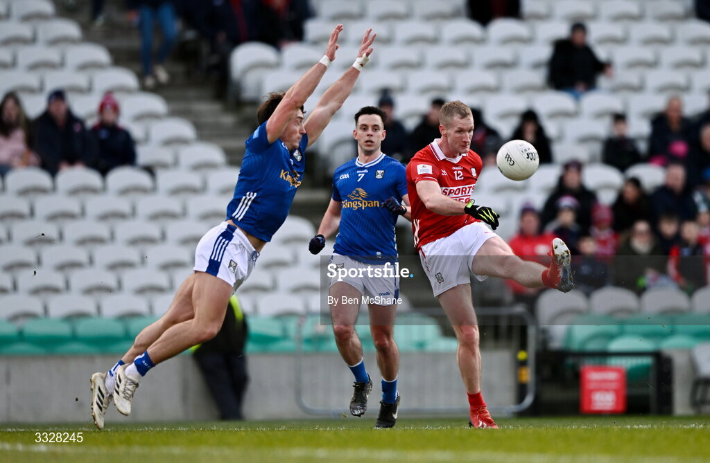 25 January 2026; Ruairí Deane of Cork kicks a point despite the attention of Conor Brady of Cavan during the Allianz Football League Division 2 match between Cork and Cavan at SuperValu Páirc Uí Chaoimh in Cork. Photo by Ben McShane/Sportsfile