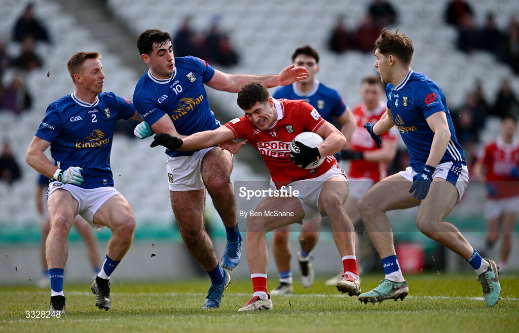 25 January 2026; Seán McDonnell of Cork in action against Cavan players, from left, Seán Brady, Paul Walsh and Tommy Walsh during the Allianz Football League Division 2 match between Cork and Cavan at SuperValu Páirc Uí Chaoimh in Cork. Photo by Ben McShane/Sportsfile