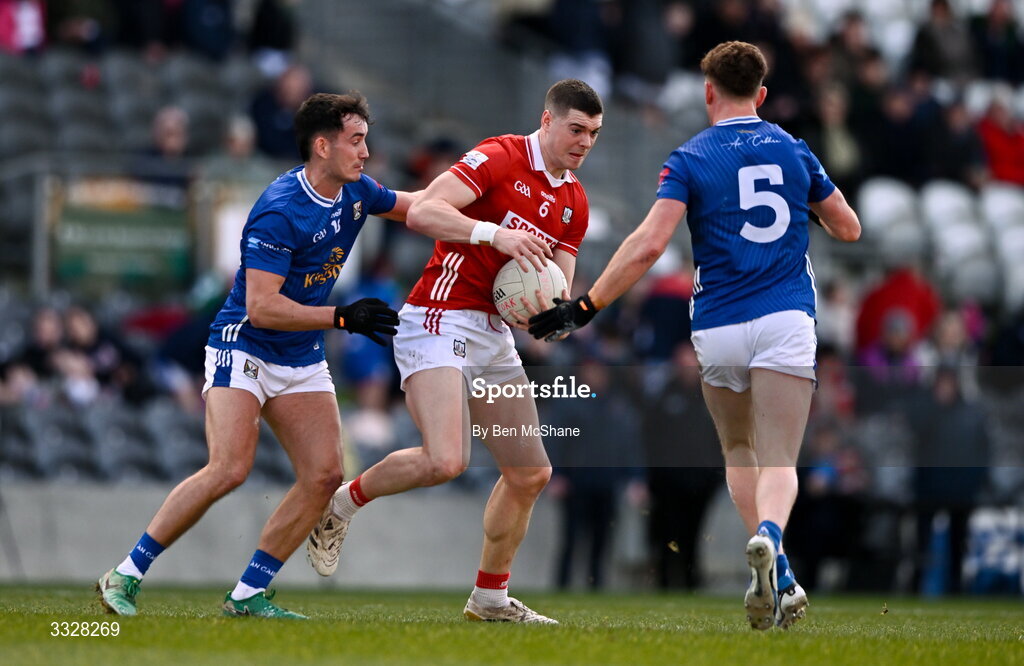 25 January 2026; Rory Maguire of Cork in action against Cormac Brady, left, and Ciaran Brady-Arva of Cavan during the Allianz Football League Division 2 match between Cork and Cavan at SuperValu Páirc Uí Chaoimh in Cork. Photo by Ben McShane/Sportsfile