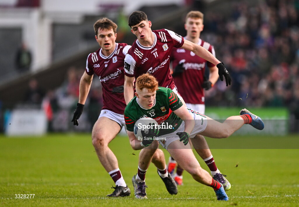 25 January 2026; Darragh Beirne of Mayo in action against Ciarán Mulhern of Galway during the Allianz Football League Division 1 match between Galway and Mayo at Pearse Stadium in Galway. Photo by Sam Barnes/Sportsfile