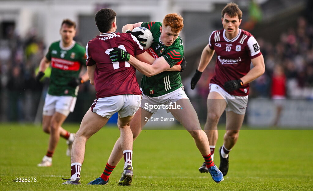 25 January 2026; Darragh Beirne of Mayo in action against Ciarán Mulhern of Galway during the Allianz Football League Division 1 match between Galway and Mayo at Pearse Stadium in Galway. Photo by Sam Barnes/Sportsfile
