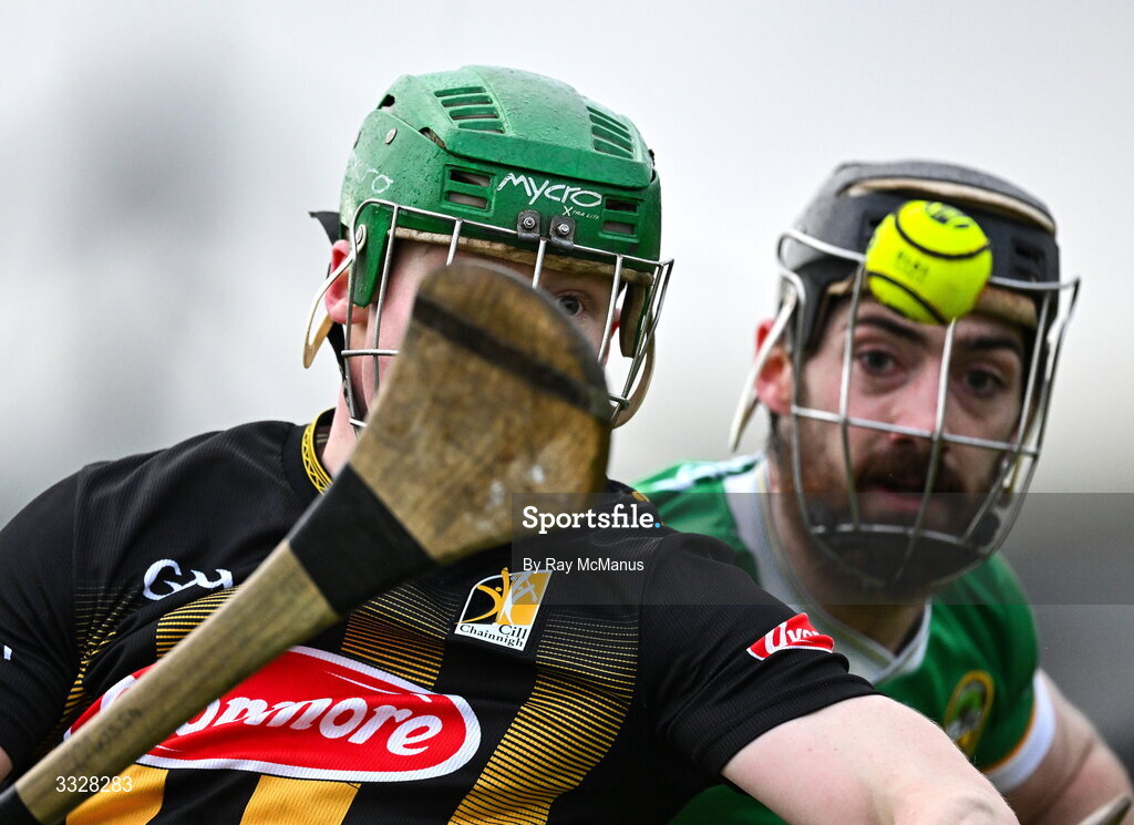 25 January 2026; Mossy Keoghan of Kilkenny and Ben Conneely of Offaly keep their eyes on the sliotar during the Allianz Hurling League Division 1A match between Kilkenny and Offaly at UPMC Nowlan Park in Kilkenny. Photo by Ray McManus/Sportsfile