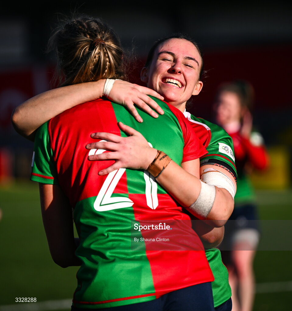 25 January 2026; Annakate Cournane of Clovers, right, hugs team-mate Aoife Grimes after their side's victory in the Celtic Challenge Round 5 match between Clovers and Brython Thunder at Virgin Media Park in Cork. Photo by Shauna Clinton/Sportsfile