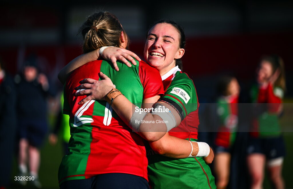 25 January 2026; Annakate Cournane of Clovers, right, hugs team-mate Aoife Grimes after their side's victory in the Celtic Challenge Round 5 match between Clovers and Brython Thunder at Virgin Media Park in Cork. Photo by Shauna Clinton/Sportsfile