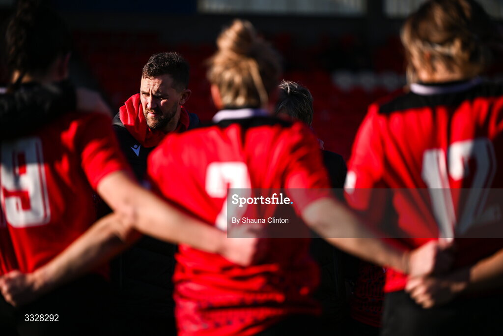 25 January 2026; Brython Thunder head coach Ashley Beck speaks to his players after their side's defeat in the Celtic Challenge Round 5 match between Clovers and Brython Thunder at Virgin Media Park in Cork. Photo by Shauna Clinton/Sportsfile