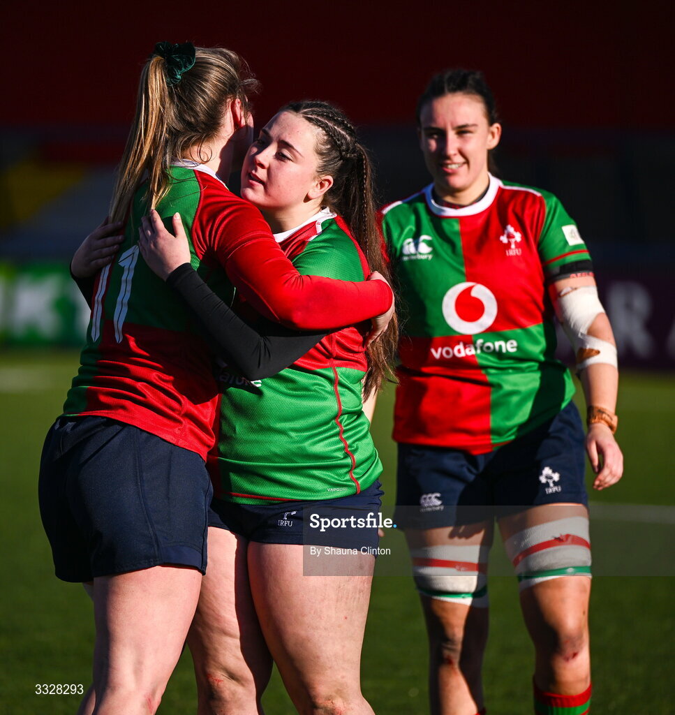 25 January 2026; Úillín Eilian of Clovers, centre, hugs team-mate Alana McInerney after their side's victory in the Celtic Challenge Round 5 match between Clovers and Brython Thunder at Virgin Media Park in Cork. Photo by Shauna Clinton/Sportsfile