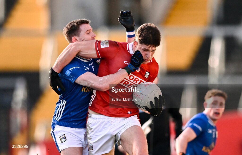 25 January 2026; Colm O'Callaghan of Cork is tackled by Ciaran Brady of Cavan during the Allianz Football League Division 2 match between Cork and Cavan at SuperValu Páirc Uí Chaoimh in Cork. Photo by Ben McShane/Sportsfile