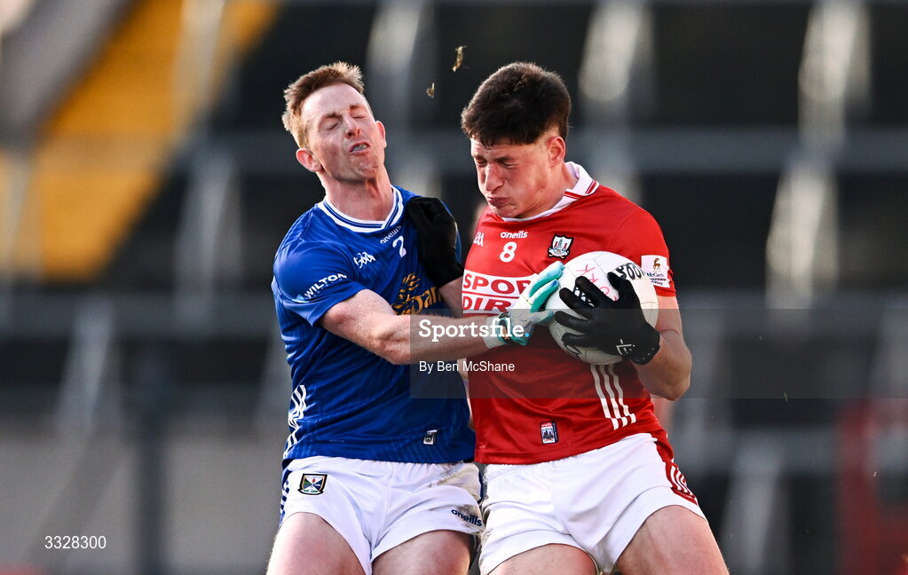 25 January 2026; Colm O'Callaghan of Cork is tackled by Jason McLoughlin of Cavan during the Allianz Football League Division 2 match between Cork and Cavan at SuperValu Páirc Uí Chaoimh in Cork. Photo by Ben McShane/Sportsfile