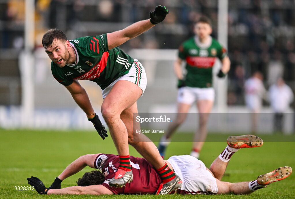25 January 2026; Aidan O’Shea of Mayo and Kieran Molloy of Galway tussle during the Allianz Football League Division 1 match between Galway and Mayo at Pearse Stadium in Galway. Photo by Sam Barnes/Sportsfile
