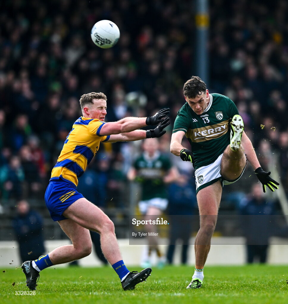 25 January 2026; David Clifford of Kerry in action against Eoin McCormack of Roscommon during the Allianz Football League Division 1 match between Kerry and Roscommon at Fitzgerald Stadium in Killarney, Kerry. Photo by Tyler Miller/Sportsfile