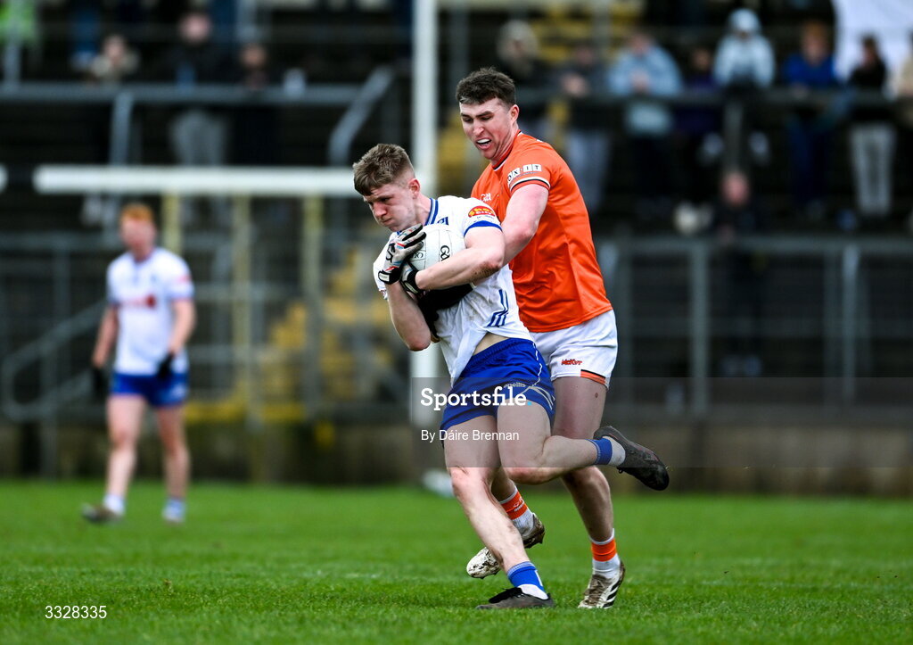 25 January 2026; Thomas Hughes of Monaghan in action against Tiernan Kelly of Armagh during the Allianz Football League Division 1 match between Monaghan and Armagh at St. Tiernach's Park in Clones, Monaghan. Photo by Daire Brennan/Sportsfile