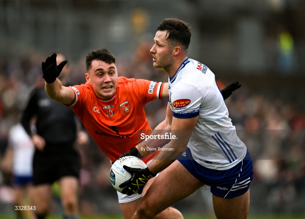 25 January 2026; Dessie Ward of Monaghan in action against Fergal O’Brien of Armagh during the Allianz Football League Division 1 match between Monaghan and Armagh at St. Tiernach's Park in Clones, Monaghan. Photo by Daire Brennan/Sportsfile