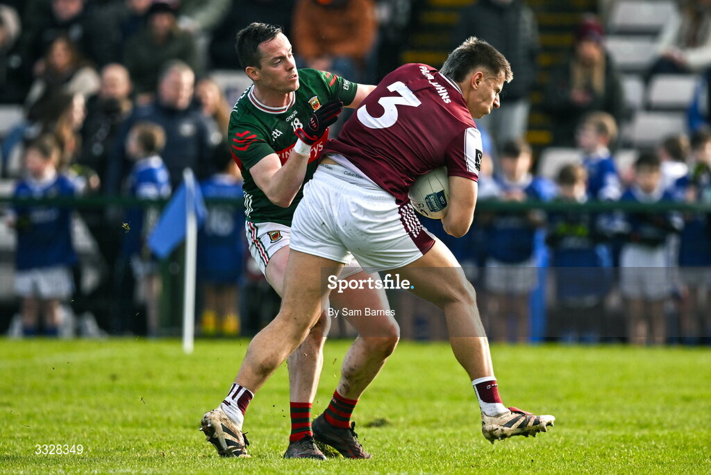25 January 2026; Seán Fitzgerald of Galway in action against Stephen Coen of Mayo during the Allianz Football League Division 1 match between Galway and Mayo at Pearse Stadium in Galway. Photo by Sam Barnes/Sportsfile