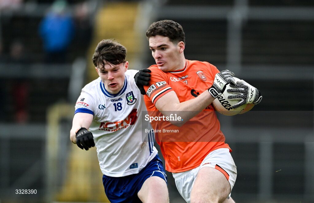 25 January 2026; Jarly Óg Burns of Armagh in action against Aaron Carey of Monaghan during the Allianz Football League Division 1 match between Monaghan and Armagh at St. Tiernach's Park in Clones, Monaghan. Photo by Daire Brennan/Sportsfile