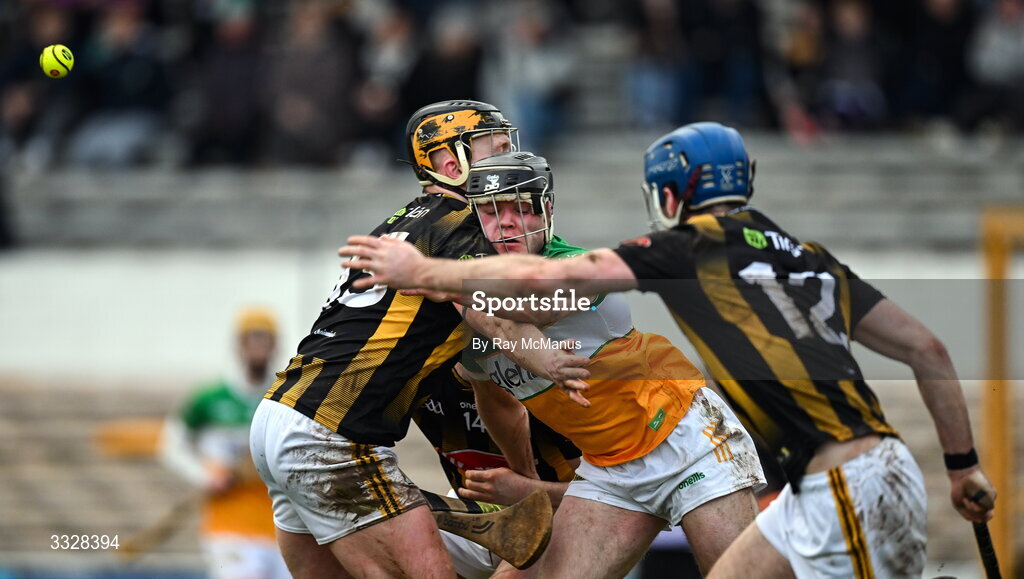 25 January 2026; Cathal King of Offaly is tackled by Kilkenny players, from left, Gearóid Dunne, Liam Moore of Kilkenny and Cathal Beirne of Kilkenny during the Allianz Hurling League Division 1A match between Kilkenny and Offaly at UPMC Nowlan Park in Kilkenny. Photo by Ray McManus/Sportsfile