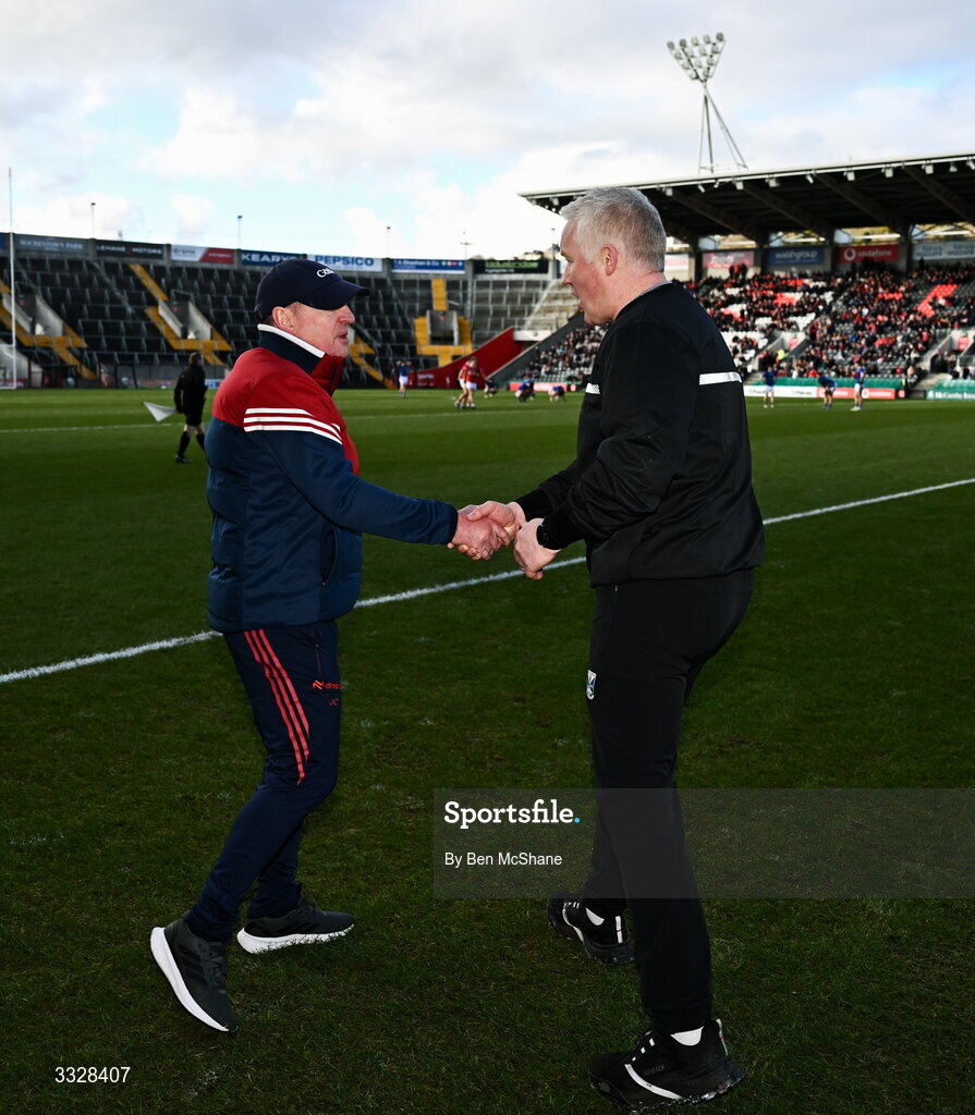 25 January 2026; Cavan manager Dermot McCabe, right, and Cork manager John Cleary shake hands after the Allianz Football League Division 2 match between Cork and Cavan at SuperValu Páirc Uí Chaoimh in Cork. Photo by Ben McShane/Sportsfile