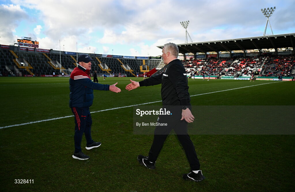 25 January 2026; Cavan manager Dermot McCabe, right, and Cork manager John Cleary shake hands after the Allianz Football League Division 2 match between Cork and Cavan at SuperValu Páirc Uí Chaoimh in Cork. Photo by Ben McShane/Sportsfile