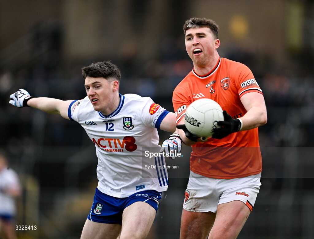 25 January 2026; Tiernan Kelly of Armagh in action against Stephen O’Hanlon of Monaghan during the Allianz Football League Division 1 match between Monaghan and Armagh at St. Tiernach's Park in Clones, Monaghan. Photo by Daire Brennan/Sportsfile
