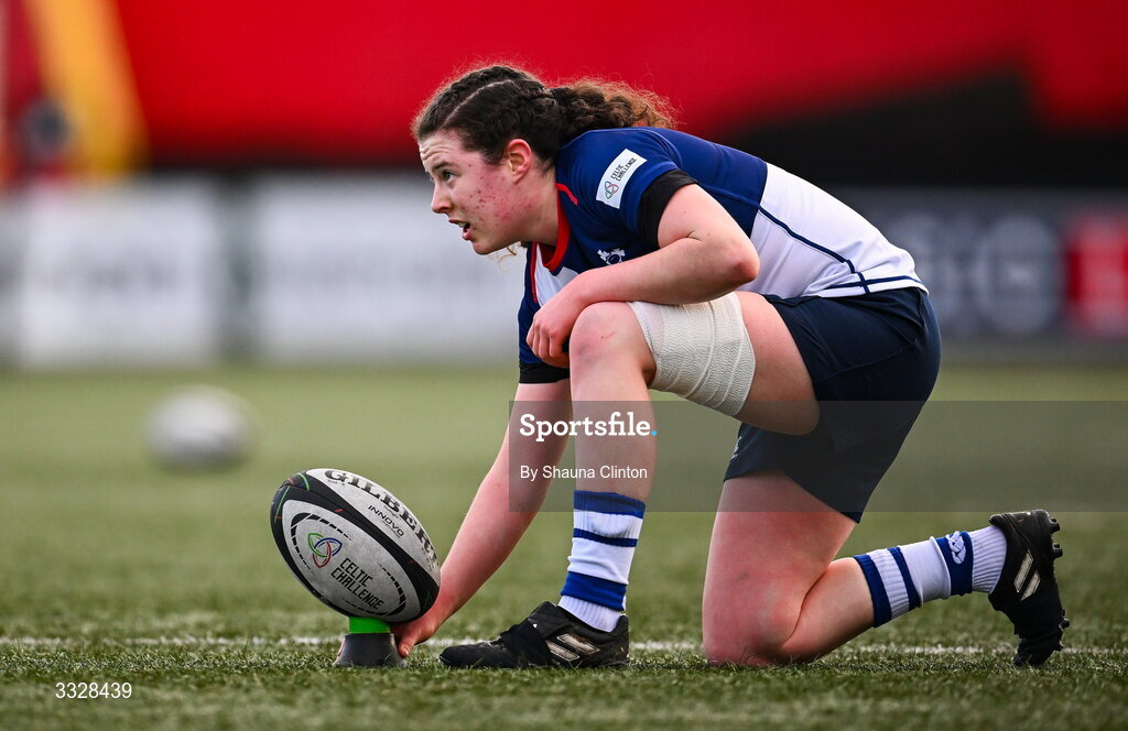 25 January 2026; Abby Moyles of Wolfhounds prepares to kick a conversion during the Celtic Challenge Round 5 match between Wolfhounds and Glasgow Warriors at Virgin Media Park in Cork. Photo by Shauna Clinton/Sportsfile