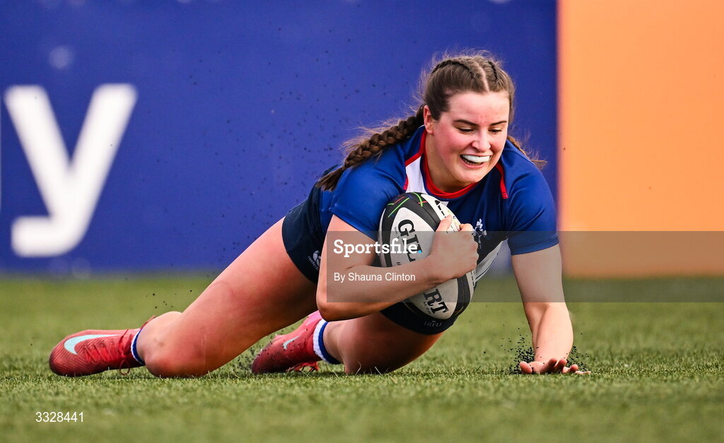 25 January 2026; Katie Corrigan of Wolfhounds runs in to score her side's third try during the Celtic Challenge Round 5 match between Wolfhounds and Glasgow Warriors at Virgin Media Park in Cork. Photo by Shauna Clinton/Sportsfile