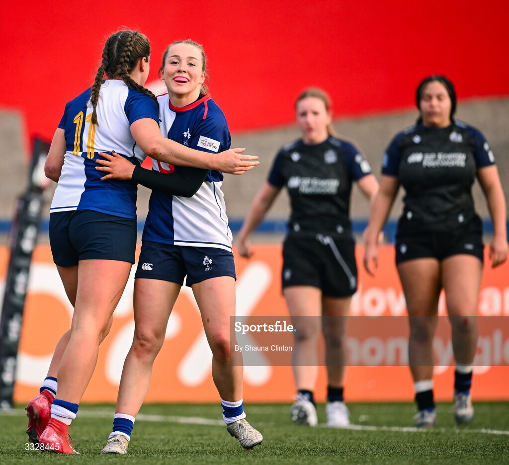 25 January 2026; Katie Corrigan of Wolfhounds, left, celebrates with team-mate Aoife Corey after scoring her side's third try during the Celtic Challenge Round 5 match between Wolfhounds and Glasgow Warriors at Virgin Media Park in Cork. Photo by Shauna Clinton/Sportsfile