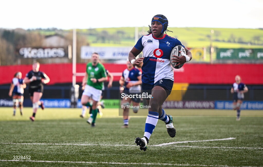 25 January 2026; Linda Djougang of Wolfhounds scores her side's fourth try during the Celtic Challenge Round 5 match between Wolfhounds and Glasgow Warriors at Virgin Media Park in Cork. Photo by Shauna Clinton/Sportsfile