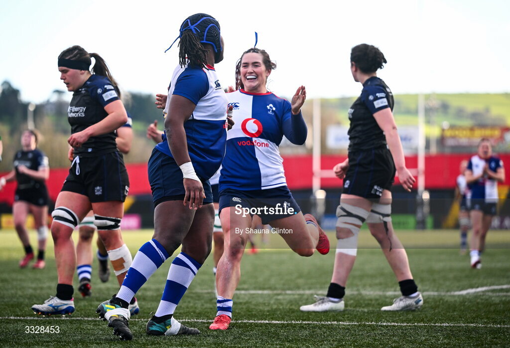 25 January 2026; Linda Djougang of Wolfhounds, left, is congratulated by team-mate Maggie Boylan after scoring her side's fourth try during the Celtic Challenge Round 5 match between Wolfhounds and Glasgow Warriors at Virgin Media Park in Cork. Photo by Shauna Clinton/Sportsfile